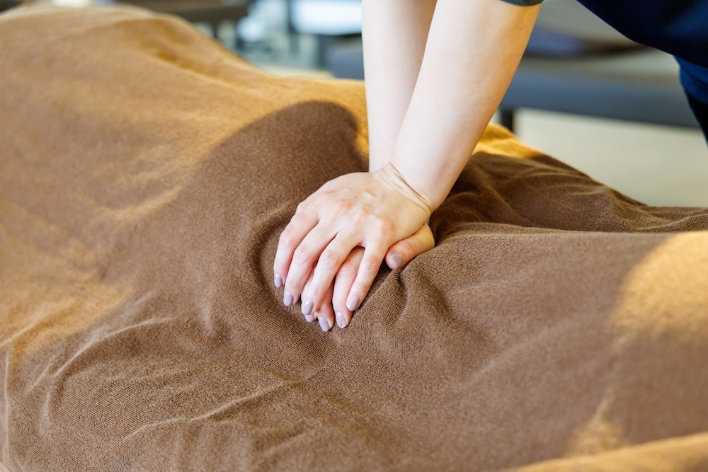 ウェアの上から、凝り固まった筋肉を指圧や手掌でほぐしていきます。
